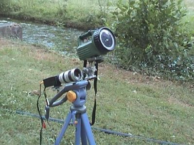 Selon les cas, j’utilise une puissante torche, ou un phare de voiture (avec une ampoule de 100w) et une petite batterie de voiture, ce qui me permet de filmer quelques heures…