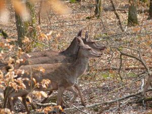 Vous longez une parcelle en régénération, dans lequel vivent de nombreux lapins. Ils creusent leurs terriers dans le terrain sablonneux ; savez-vous que les lapins réingèrent leurs crottes pour mieux assimiler tous les éléments dont ils se sont nourris ? Le renard vient chasser ces lagomorphes qui sont très prolifiques. Il les pourchasse en s’approchant le plus près possible sans se faire repérer, puis en quelques bonds, il se précipite sur sa proie ! Mais les lapins sont souvent les plus rapides ! Des hardes de biches sont visibles à l’aube ou au crépuscule, lorsqu’elles se rendent à leur gagnage. Les cerfs, plus discret sont toujours les derniers lorsque la harde se déplace.
